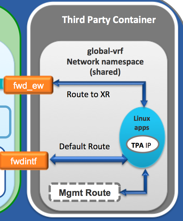 global-vrfnetwork namespace with the container; specifically, in this section:This makes the architecture work seamlessly for