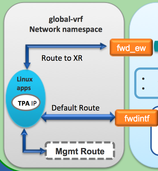 The XR linux shell that the user interacts with is really the global-vrf network namespace inside the control plane container. This corresponds to the global/default-vrf in IOS-XR.