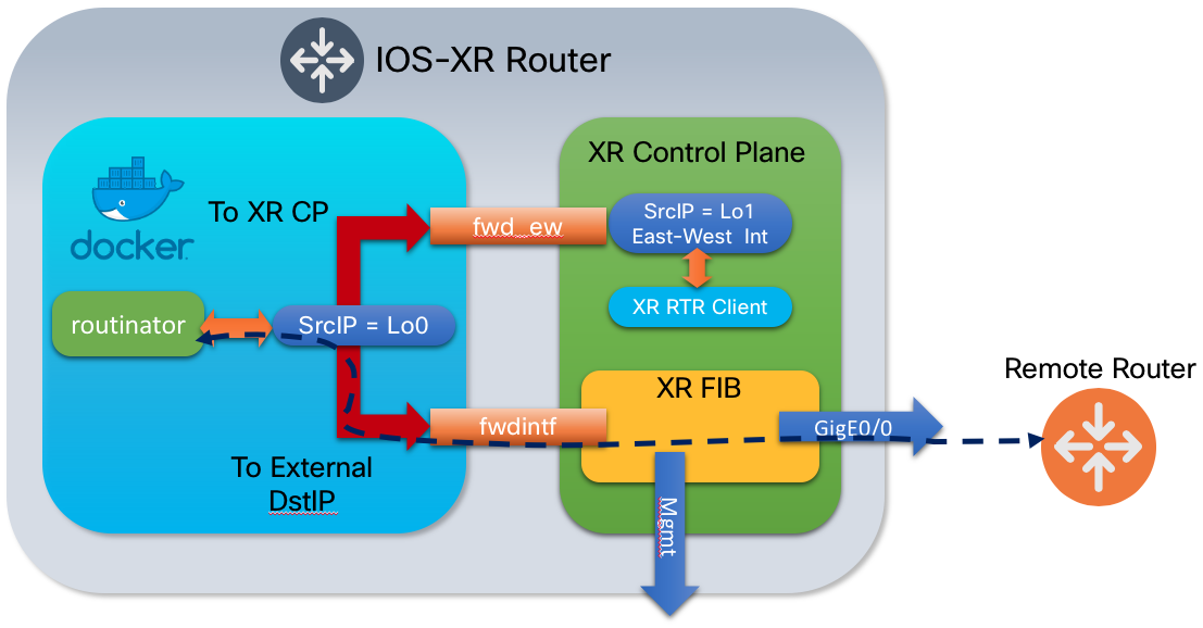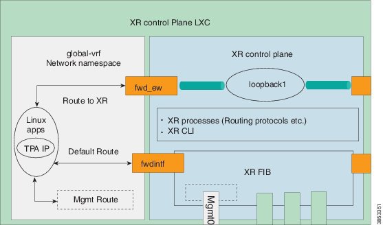 The XR Linux environment uses specific virtual interfaces to forward packets from a container to the local XR control-plane or to send packets outside the router using the XR FIB. In the default configuration the fwdintf interface is used to route packets out the appropriate external or management interface using the XR FIB. The fwd_ew interface is used for East-West communication between third party applications and the XR control plane.