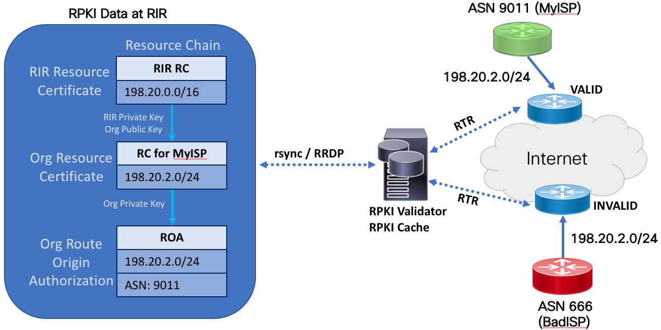The steps how ASN and ROA records are used to validate a specific prefix is outlined in RFC6488, section 3. The consumer of the RPKI data, the relying party, must go through these steps in order to validate the signed objects and generate a list of prefixes with a valid cryptographic chain. The validation software will first use a seeded Trust Anchor Location or TAL for each RIR to begin downloading the chain of certificates used to eventually create prefix data for the router to use. RPKI data is stored in RIR, LIR, and delegated repositories so all of those must be traversed to gather data and validate the objects against the signers public key. RPKI data is downloaded using either rsync (legacy, may be deprecated) or RRDP. RRDP offers a more efficient way to download the data and runs over HTTPS.