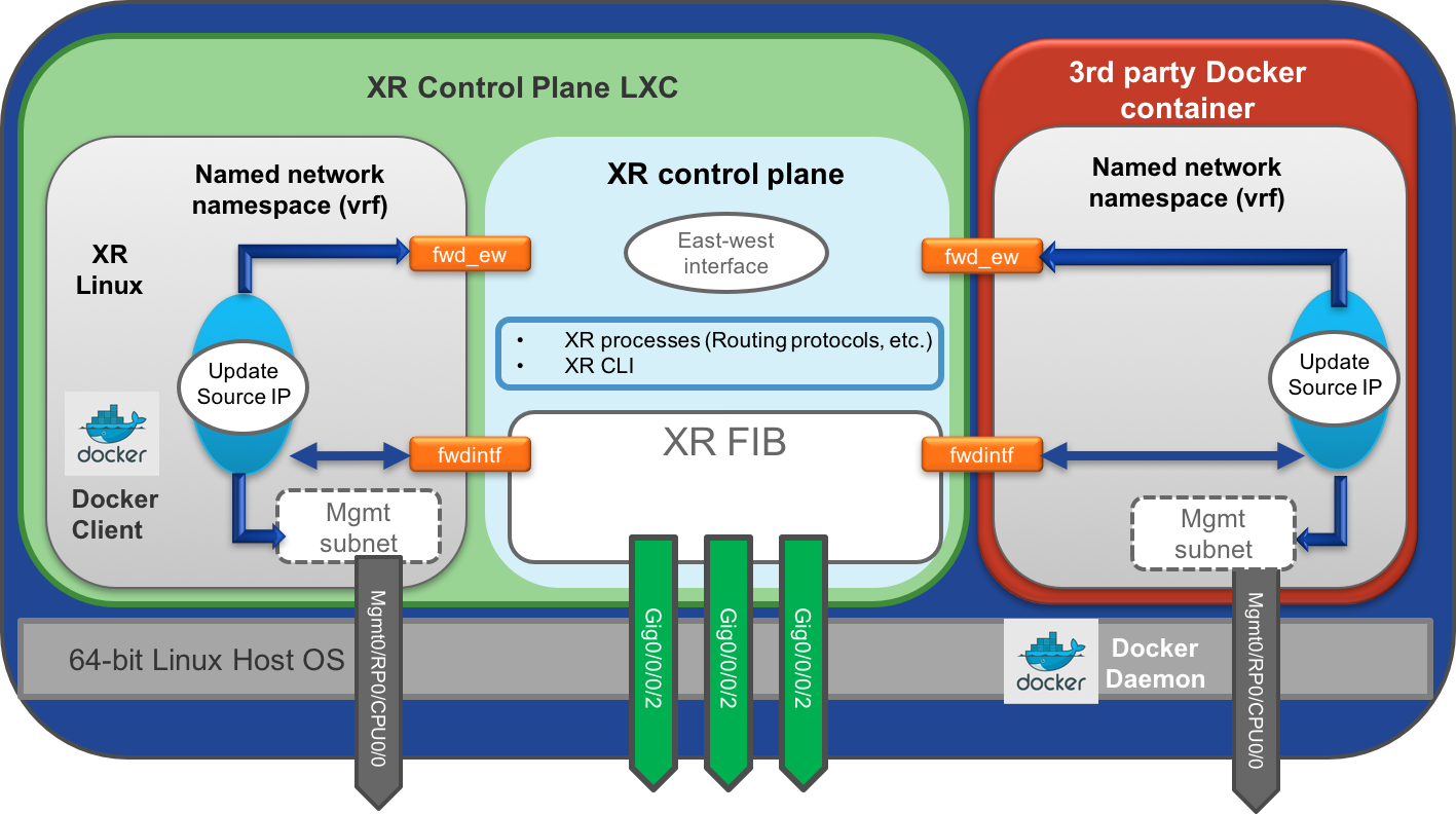 In order to isolate different components between the base Linux OS and IOS-XR control-plane, Linux namespaces and specific routing tables are used. By default, a Docker container has no access to the XR global namespace. In addition to the global namespace, named "global-vrf", each VRF instance created in XR creates a new Linux nanespace. This isolation can be used creatively to limit communication between IOS-XR and third party applications, or between third party applications themselves.