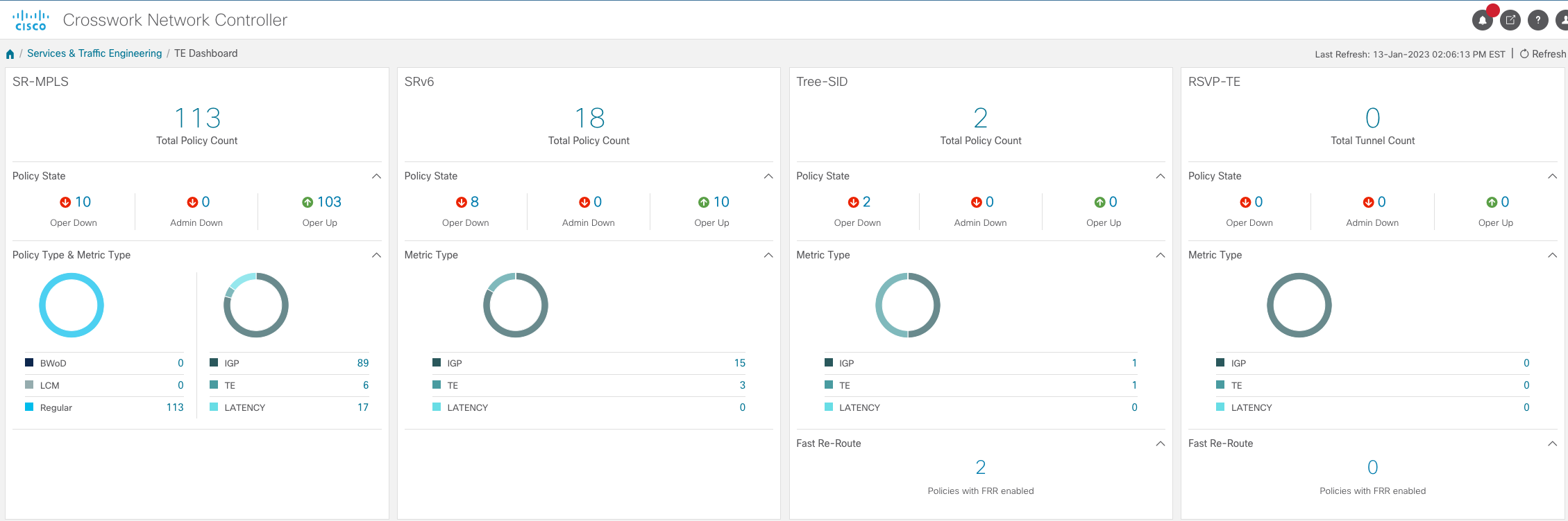 The Traffic Engineering dashboard gives summary information for all TE path types