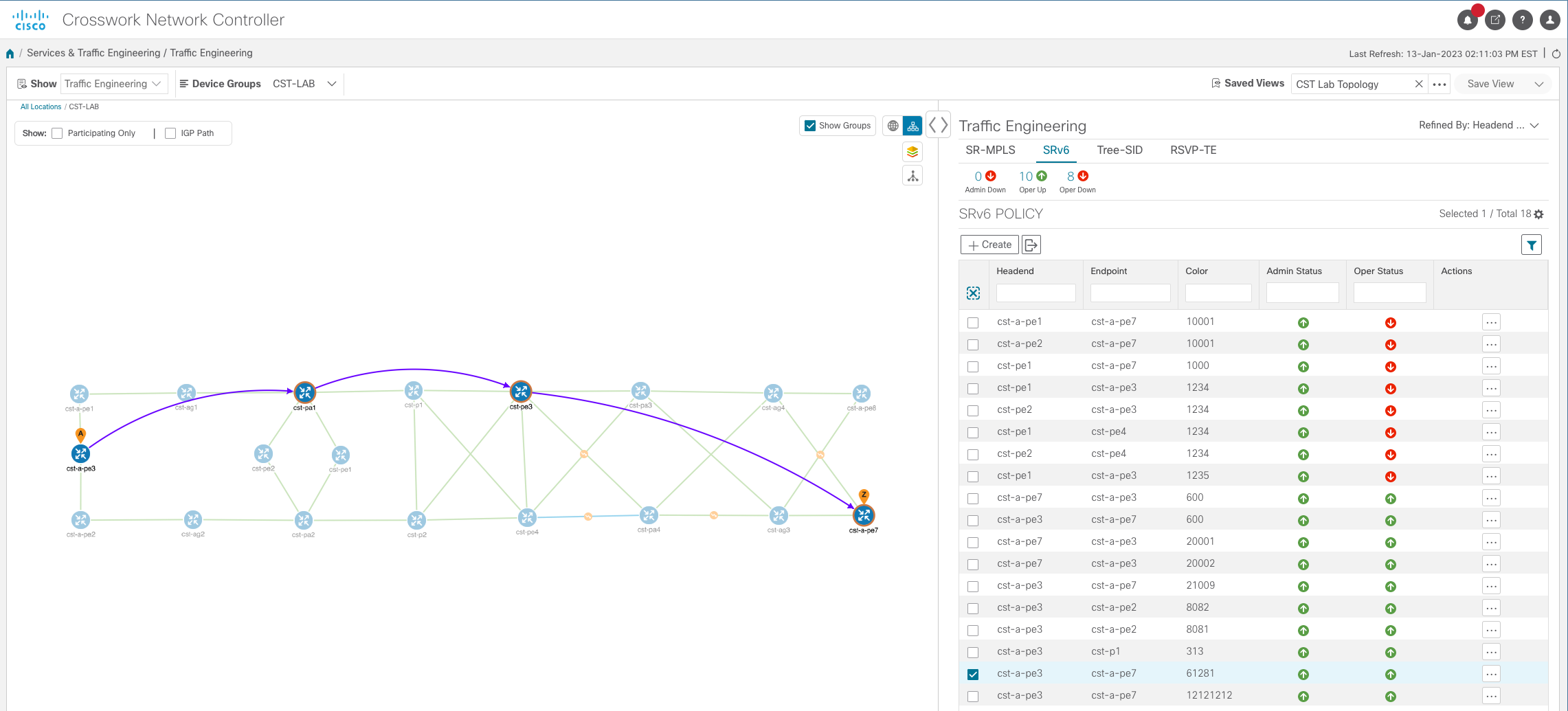 SRv6 supports the same TE Policy functionality as SR-MPLS. In cases where more advanced TE is required than Flex-Algo provides, such as defining explicit paths or requiring a path be disjoint from another path, SRv6-TE can be utilized. In CST SRv6 1.0, on-demand networking can be used for supported services with SR-PCE to compute both intra-domain and inter-domain paths. Provisioning, visualization, and monitoring of SRv6-TE paths is available in Crosswork Network Controller 4.1.