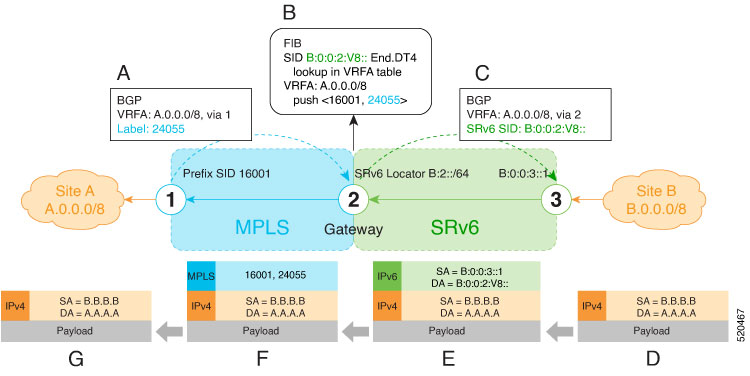 In 7.8.1 IOS-XR supports two transition technologies used to interwork between traditional MPLS and SRv6 domains. Interworking between different data plane types can take place using transport layer interworking or service layer interworking. The transition methods supported in CST SRv6 1.0 and IOS-XR 7.8.1 utilize service interworking and support IPv4 and IPv6 L3VPN services.