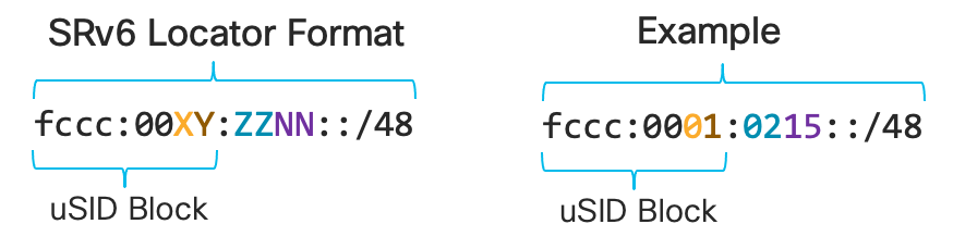 Using the compressed SID or micro-SID format requires defining the IPv6 address structure segmenting the IPv6 address into a C-SID portion and Locator block portion. A dedicated IPv6 prefix should be used for SRv6 and SRv6 micro-SID allocation. RIR assigned public prefixes can be utilized or private ULA space defined in RFC4193.