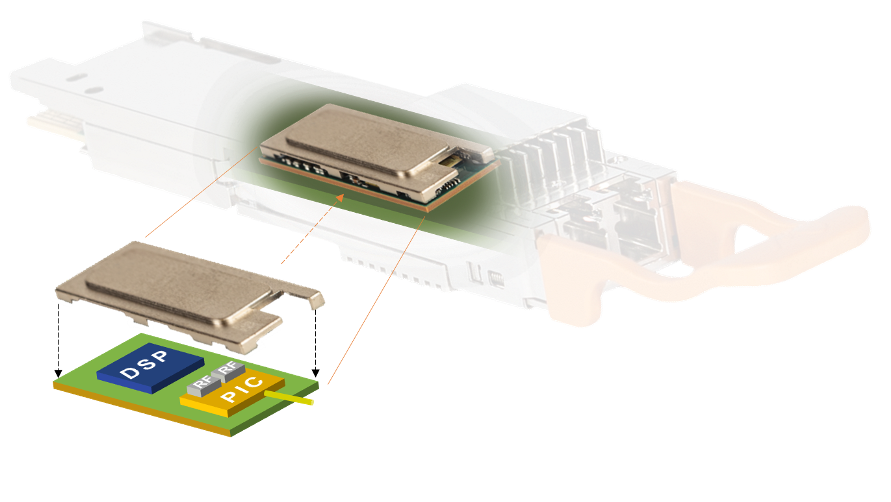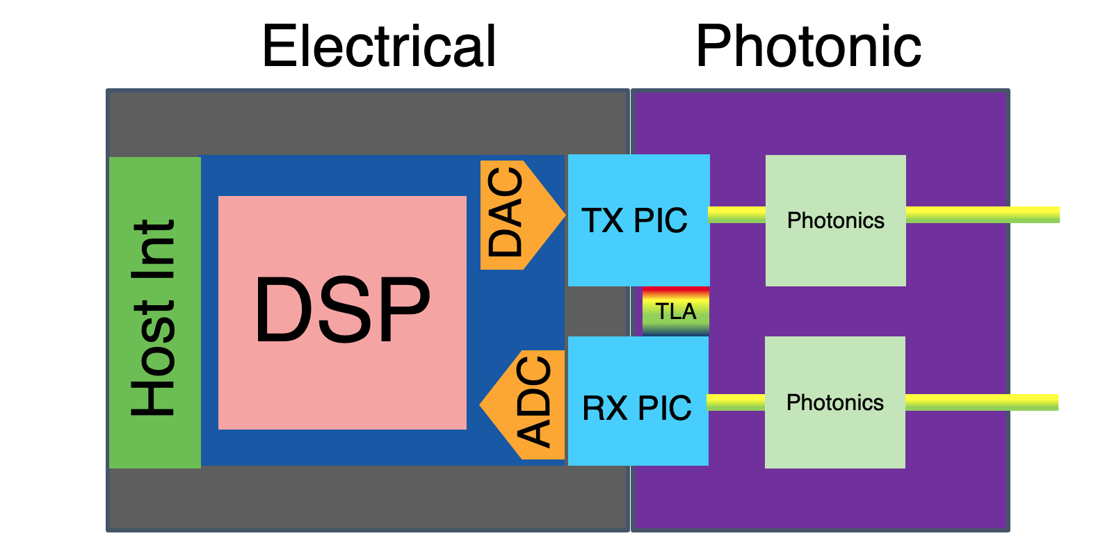 At some point in the signal path a translation between the electrical signal to the optical signal must take place. This is done through the use of modulators and receivers built using Photonic Integrated Circuits in modern DCO. These are commonly referred to as opto-electric modules because they span both signal domains. The electrical signal generated by the DSP and then the DAC is used to modulate the transmit optical laser to match the data being sent.