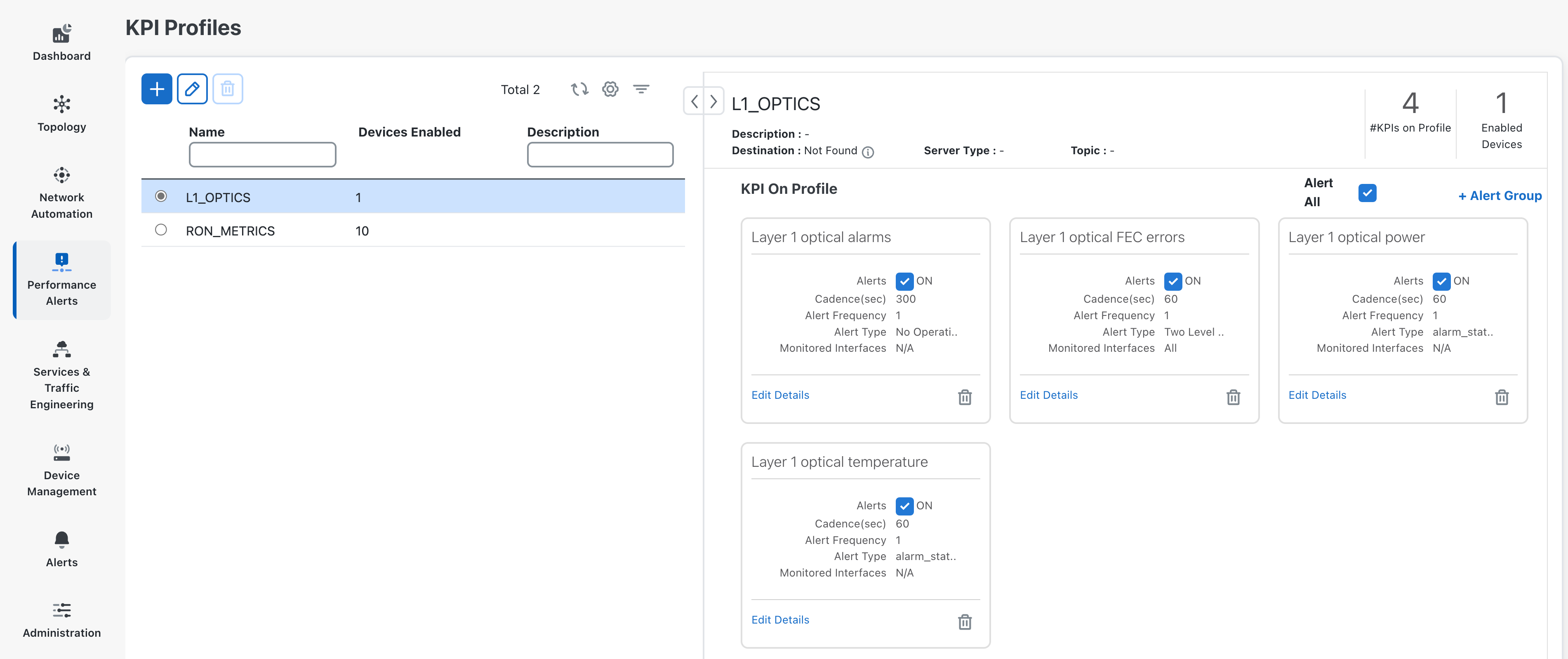 A set of KPIs are grouped together as part of a KPI Profile. This allows the user to have a set of KPIs applied to a set of devices without having to manage per-device individual KPIs. When a KPI is added or removed from an active profile, telemetry collection will start for the devices using the KPI profile.