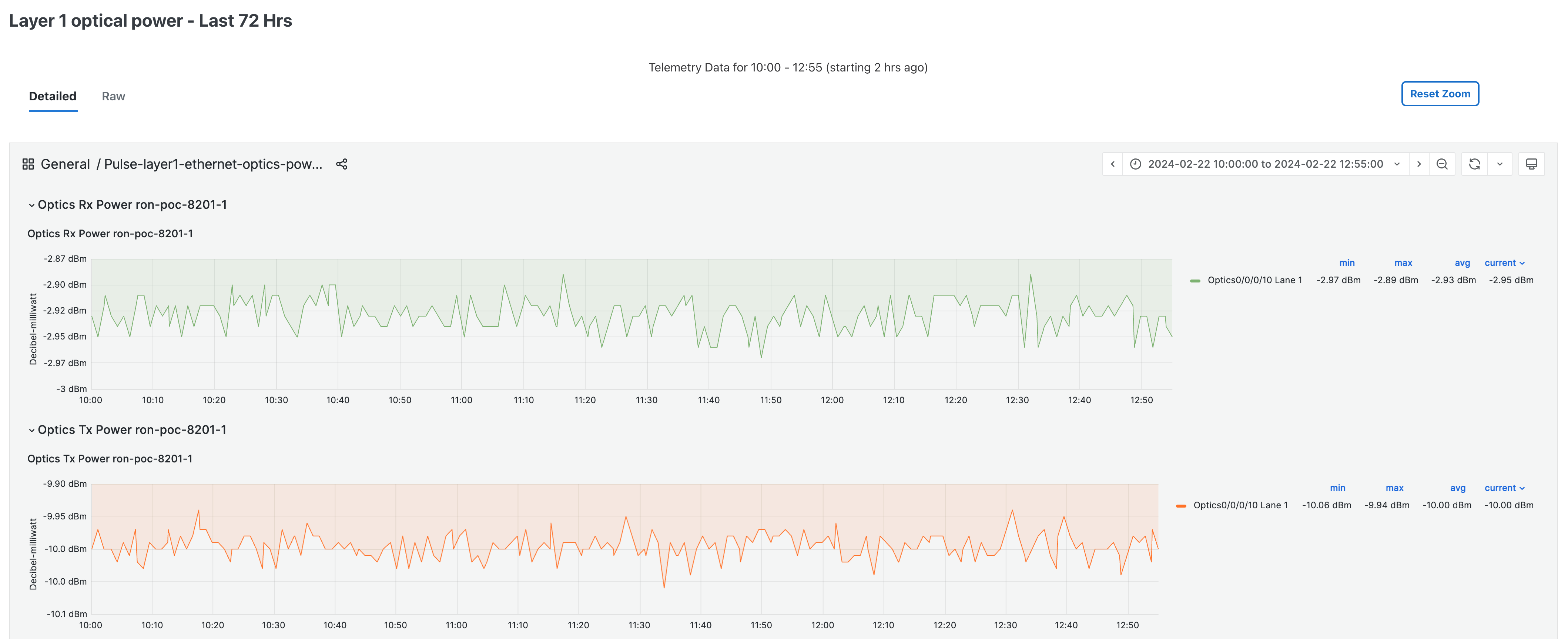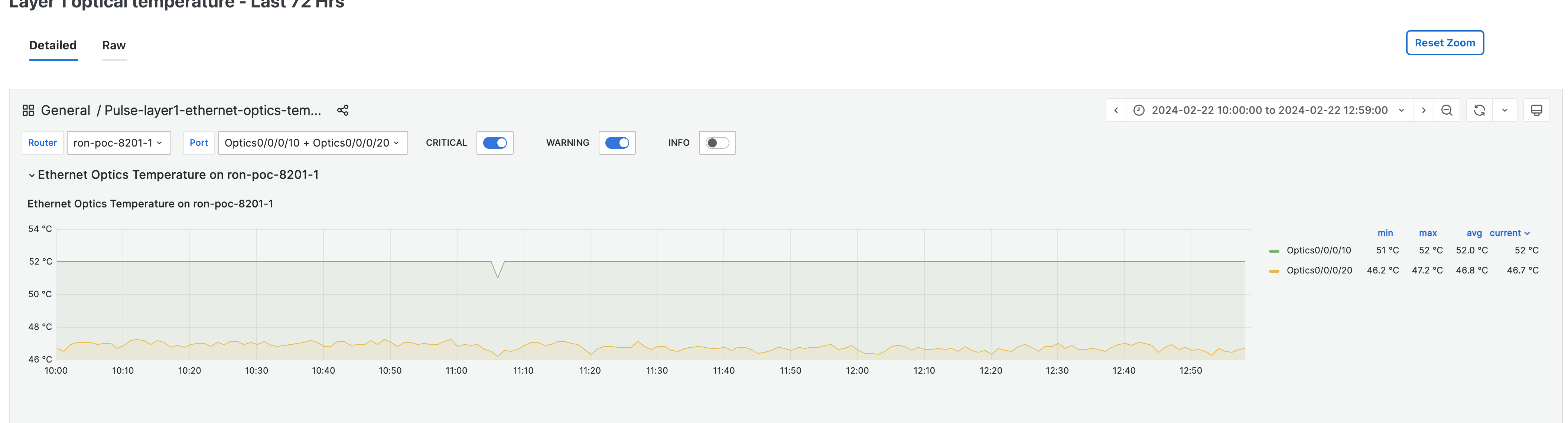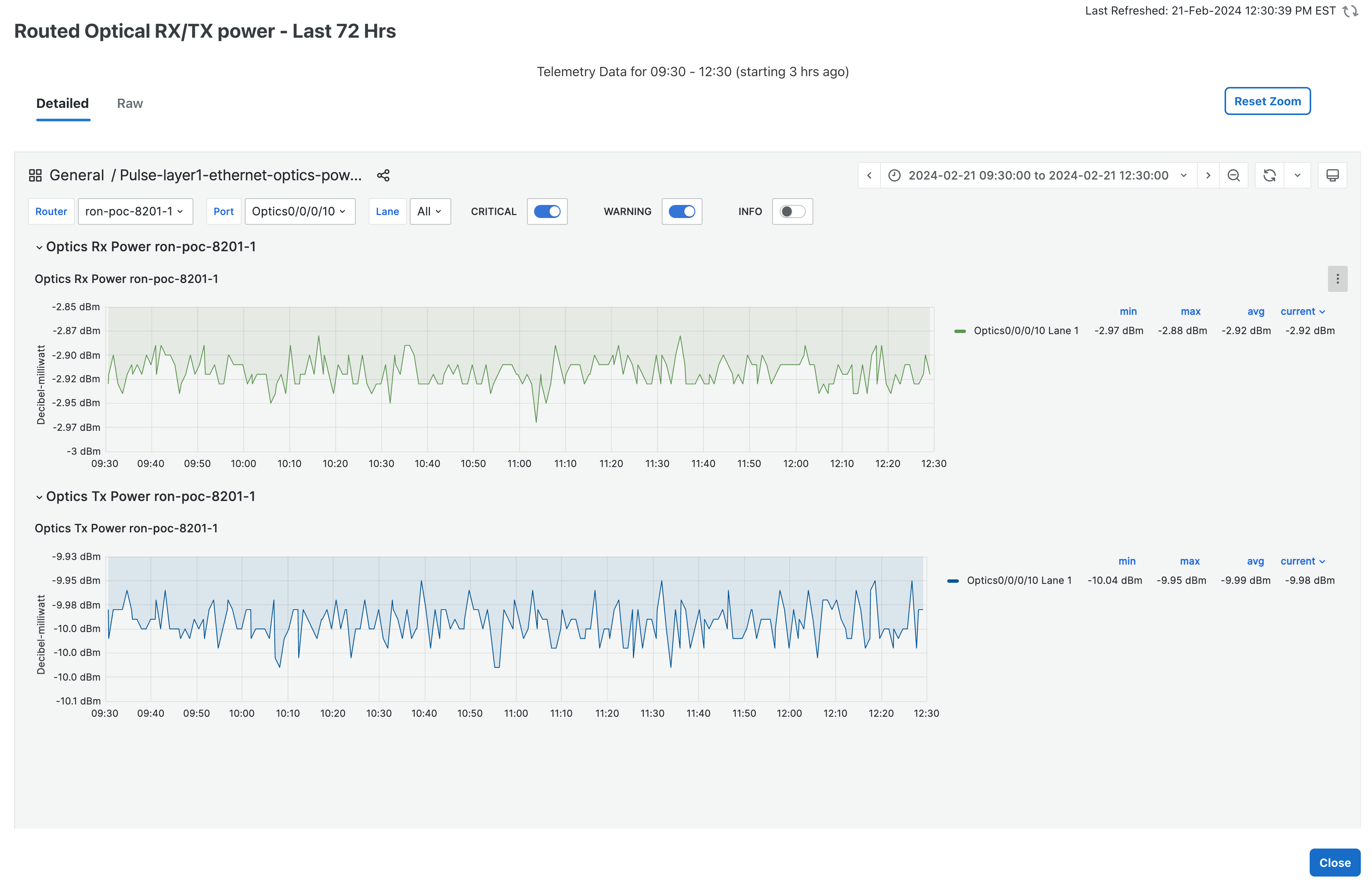 The Health Insights application within CNC can be used to monitor any available telemetry sensor paths including the Optical and Digital PMs we've discussed. Health Insights can also be configured to alert based on different criteria such as deviations in measured values or absolute value changes. The Health Insights documentation located here can be used as a reference: