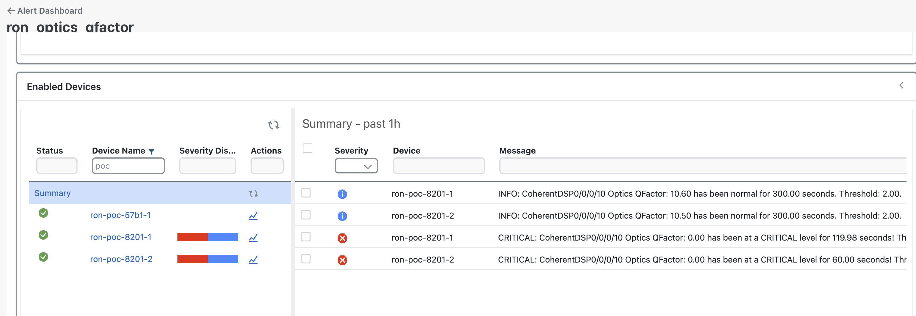 The following shows alerts triggered by our custom KPIs. A critical alarm is raised when the Q-Factor of the DCO drops below .5 for a specific amount of time, and clears when the Q-Factor returns to a nominal value.