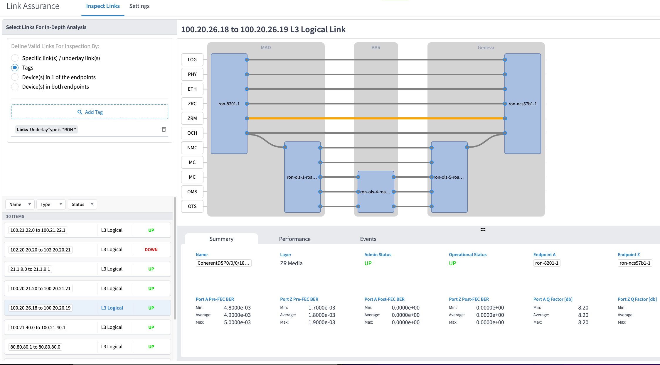 Crosswork Hierarchical Controller or HCO has capabilities for monitoring Routed Optical Networking PM for both the IP and Optical Line System layers in the same tool together. HCO's Link Assurance application presents an end to end multi-layer view of circuits using DCO endpoints and overlays relevant PM data on the view.